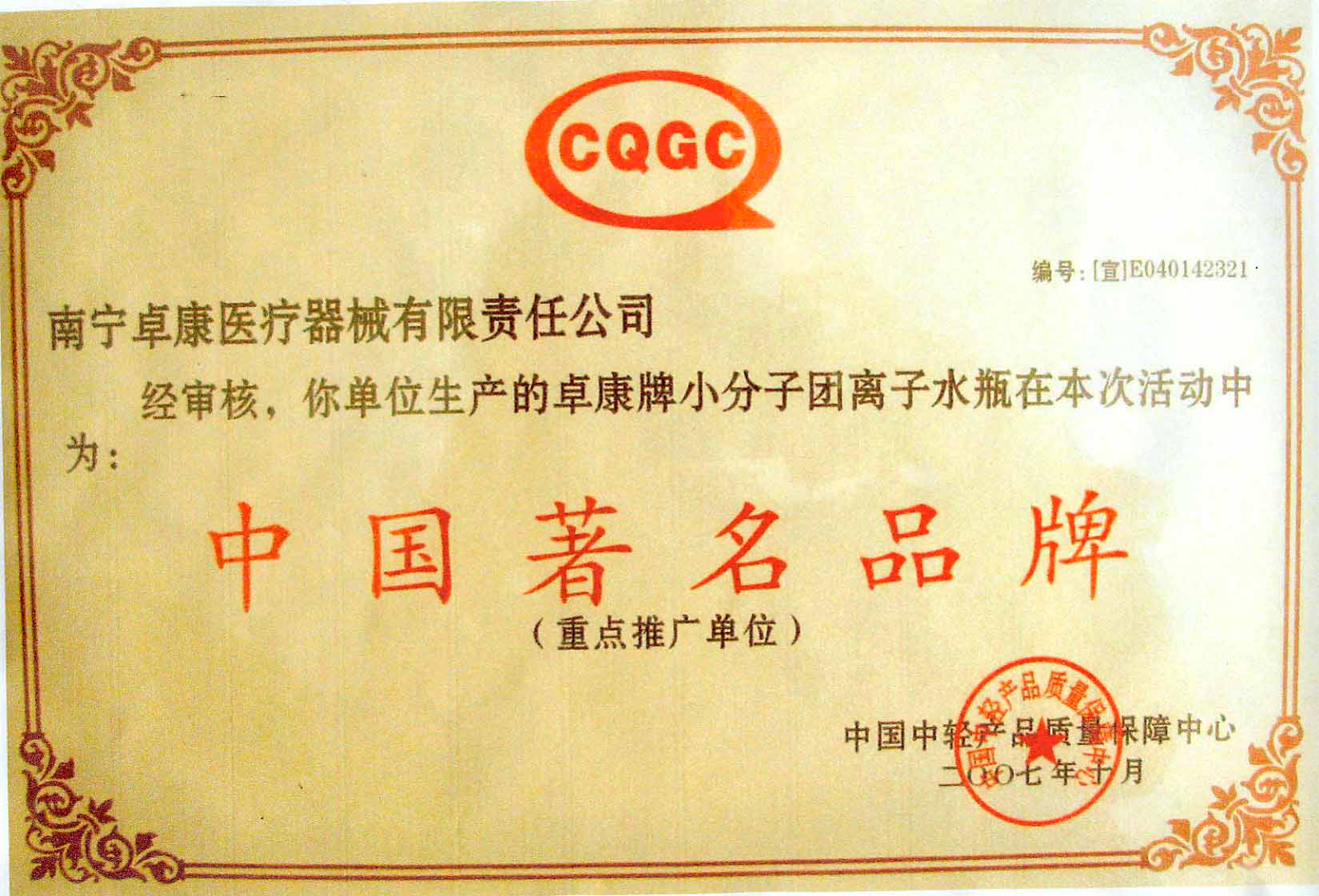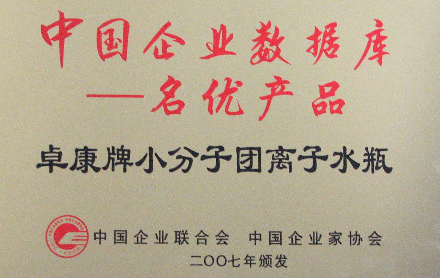 卓康牌離子水瓶榮獲中國企業(yè)名優(yōu)產(chǎn)品[點(diǎn)小圖見大圖]、中國著名品牌稱號[點(diǎn)小圖可見大圖]