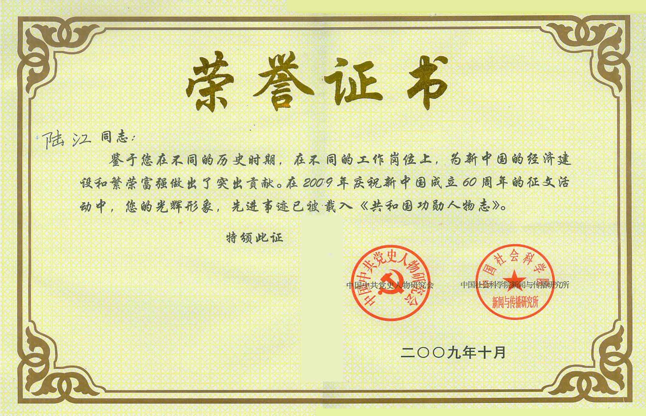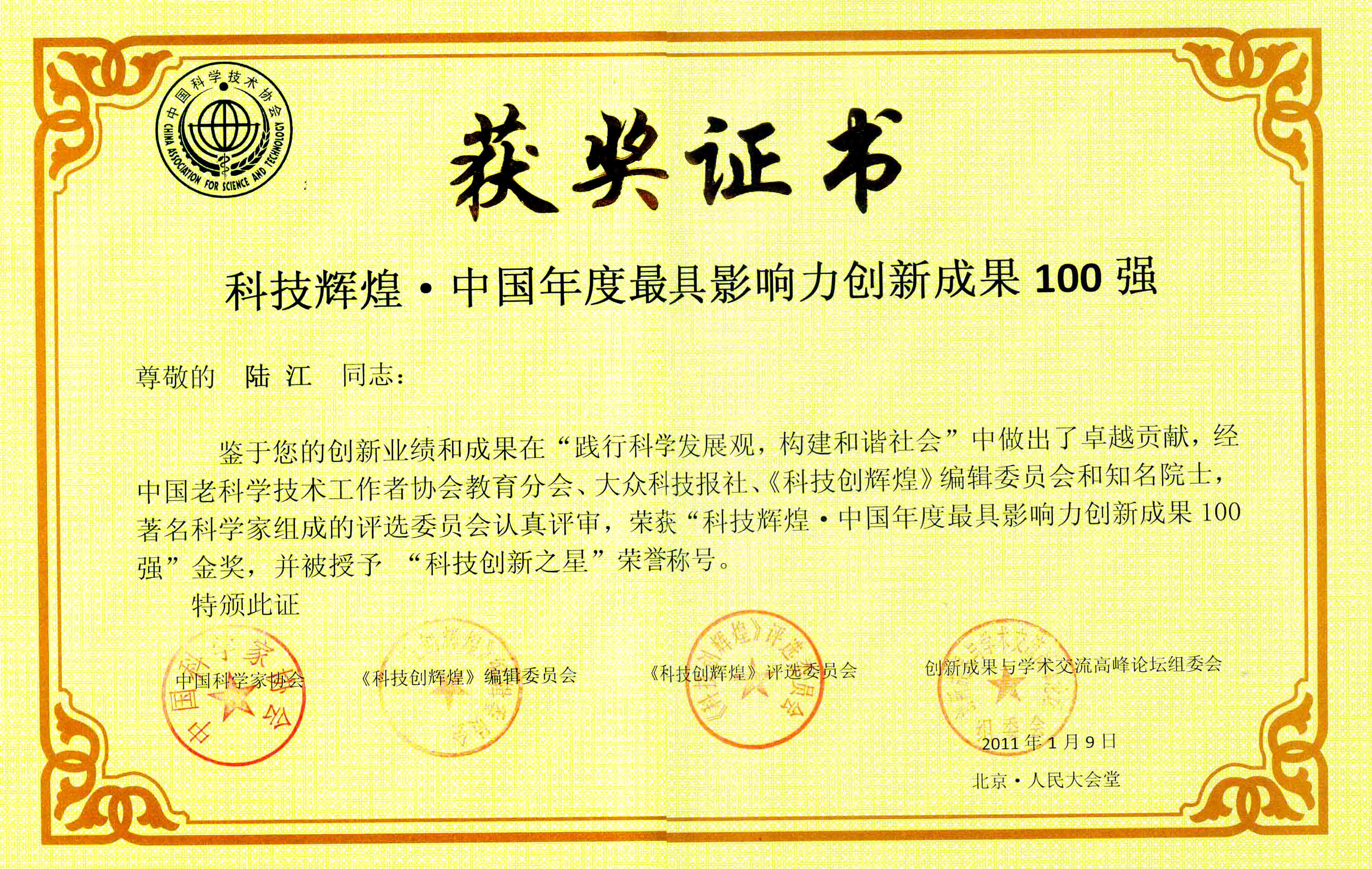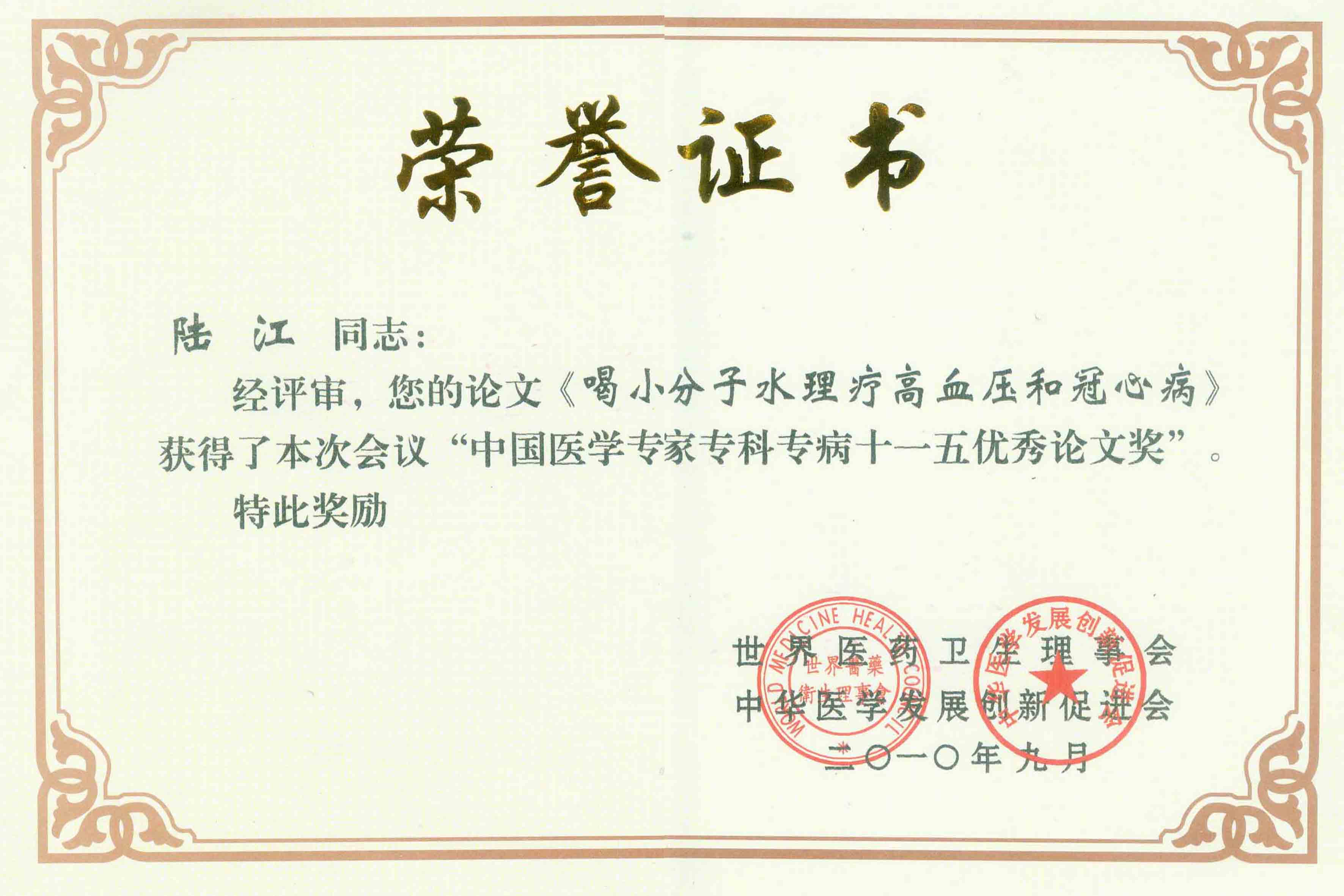 陸江的論文獲一等獎榮譽(yù)證書-- 陸江論文獲創(chuàng)新論文獎牌