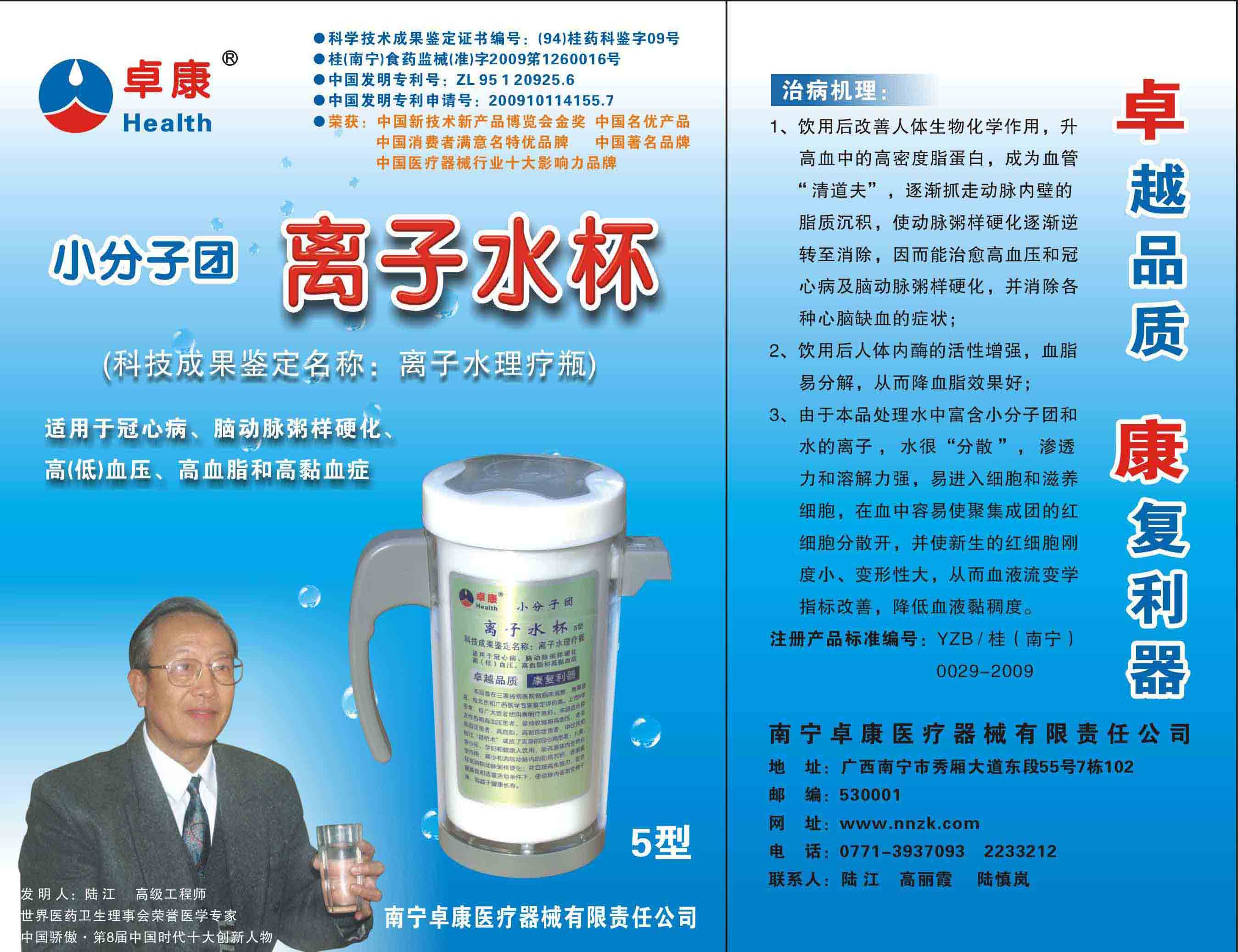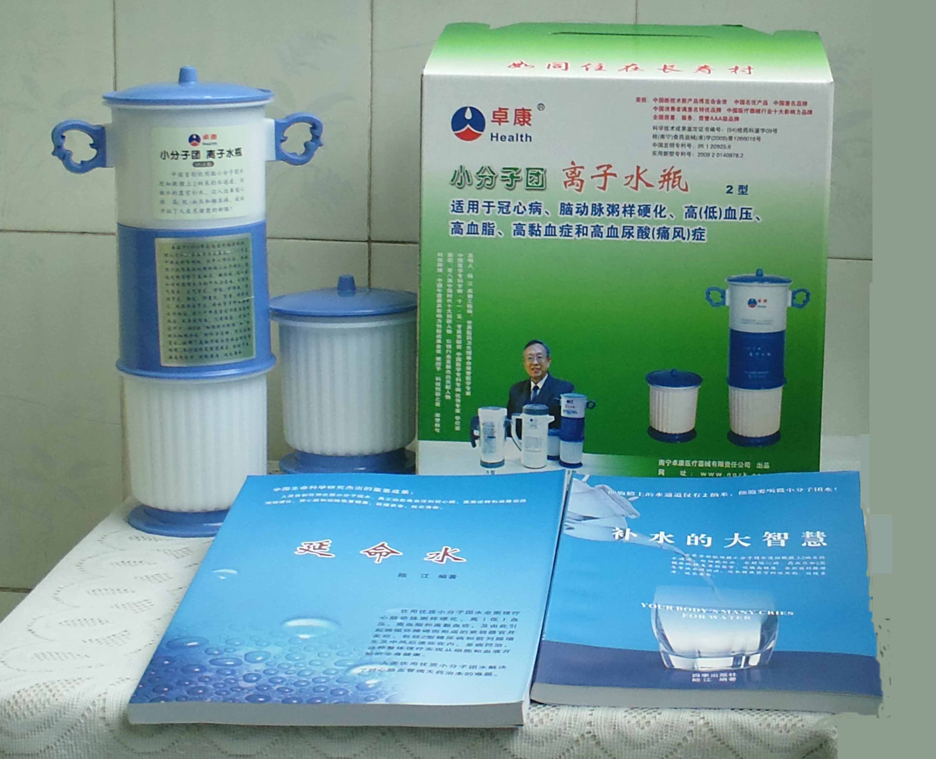-----我是從事建筑的高工,本來沒有資格去攻克醫(yī)學(xué)難題,卻為了自身健康才扣響醫(yī)學(xué)的大門。由于我1990年患高血壓,因怕中風(fēng)才研究發(fā)明了離子水瓶,我把水處理成微小分子團(tuán)水,飲用后治愈了高血壓。便于1993年底送到三家省級醫(yī)院做臨床試用4個月。經(jīng)北京和廣西醫(yī)學(xué)專家鑒定:"降脂降壓效果好"," 能擴(kuò)大心腦動脈流量,改善心腦電圖以及微循環(huán)","對治療心腦動脈粥樣硬化、高血壓、高血脂有良好的醫(yī)療保健作用。""產(chǎn)品的技術(shù)性能和療效達(dá)到了同類產(chǎn)品的國內(nèi)領(lǐng)先水平,經(jīng)廣西醫(yī)學(xué)科學(xué)情報(bào)研究所檢索,未見國外有類似報(bào)道。"中國醫(yī)學(xué)科學(xué)院張正國教授從美國國立醫(yī)學(xué)圖書館數(shù)據(jù)庫存Medline檢索英俄文資料,均未見類似報(bào)告。2000年上市后,我為了對消費(fèi)者負(fù)責(zé)而繼續(xù)觀察研究,一直通過《信譽(yù)卡》和《質(zhì)量跟蹤調(diào)查書》向患者承諾療效,請用戶使用6個月后反饋效果。和脂壓患者飲用2至5個月內(nèi),消除癥狀,停服藥物,血壓正常;冠心病患者飲用3~5個月逐漸減輕至消除心絞痛、房顫等癥狀,不再服藥,飲用1年左右心電圖正常,經(jīng)冠脈造影掃描無明顯狹窄,表明冠心病痊愈。大量患者還反映許多衰弱器官被修復(fù),讓前列腺增生、慢性咽喉炎、慢性氣管炎、支氣管炎、慢性胃炎、腸炎和膽囊炎等不藥而愈;2型糖尿病患者是因?yàn)橐葝u衰弱致病,飲用該水半年至一年,逐漸減藥至停藥,血糖尿糖正常,真正治愈2型糖尿病。中風(fēng)后遺癥患者飲用六七個月,可逐漸減輕至消除肢體和語言障礙,表明飲用該水能讓壽命很長的神經(jīng)元細(xì)胞逐漸修復(fù),奇跡般地恢復(fù)肢體和語言功能。飲用后還使胸腺和脾臟兩個重要的免疫器官被修復(fù)和增強(qiáng),產(chǎn)生免疫細(xì)胞多,提高了免疫力,使人不生病或少生病。自此, 飲用微小分子團(tuán)水創(chuàng)造了攻克冠心病、高(低)血壓和糖尿病三大醫(yī)學(xué)難題的奇跡。人們對此感到不可思議,但實(shí)踐是檢驗(yàn)真理的唯一標(biāo)準(zhǔn)。